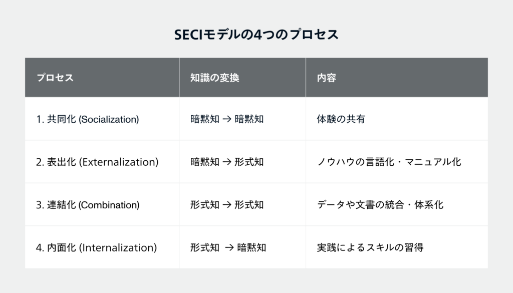 SECIモデルは、知識が「個人から組織へ」、そして「組織から再び個人へ」と循環しながら拡大していく過程を4つのプロセスで説明しています。
