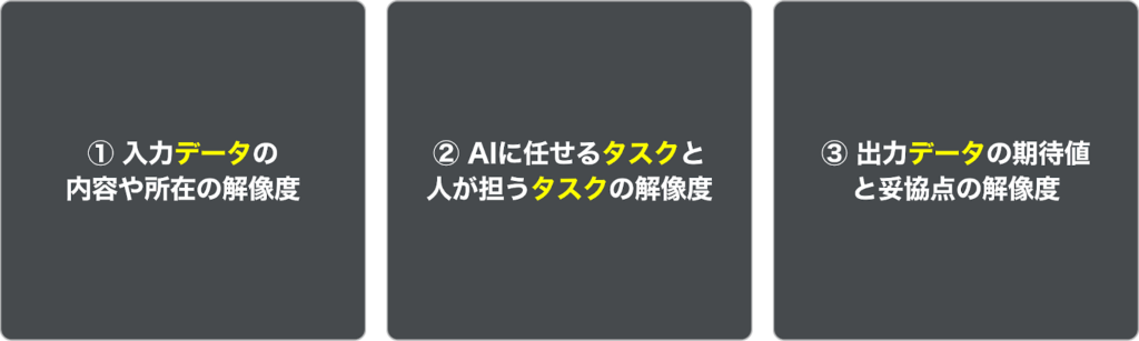 AI活用のユースケースを具体化するには、業務フローからもう一歩踏み込み、次の3つの観点で解像度を高めることが重要です。
