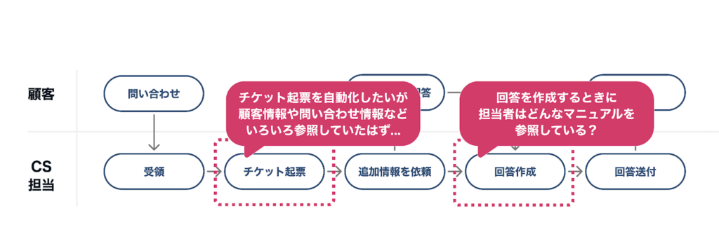 顧客情報、契約情報、問い合わせの内容…。しかし、業務フローには「チケット起票」としか書かれていません。