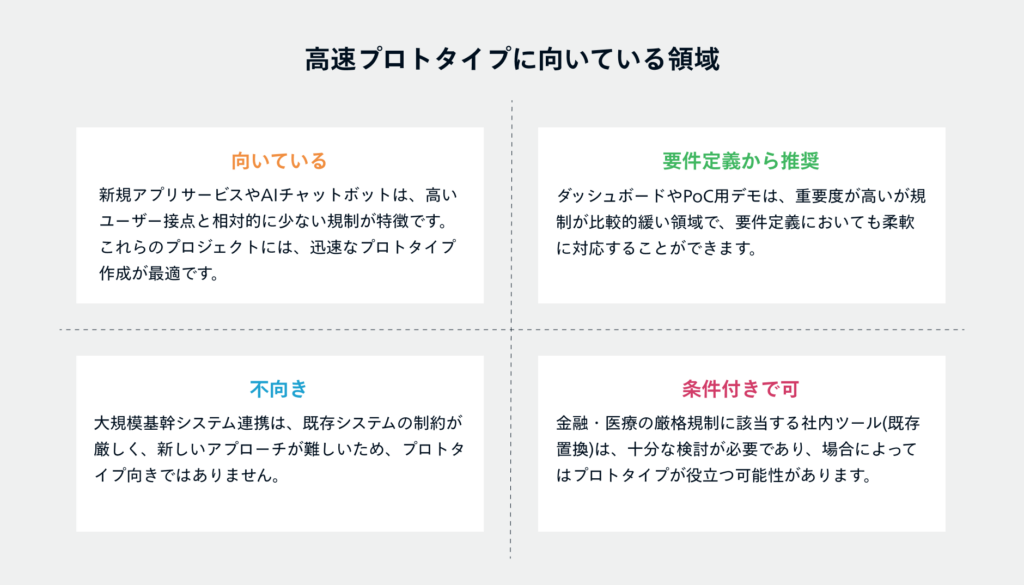高速プロトタイプは、新規体験の検証や業務判断支援に最適です。一方、規制対応や基幹システム連携が必要な場合は、要件定義を重視した慎重なアプローチが求められます。