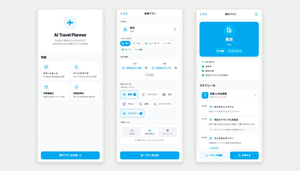 行き先・期間・嗜好から旅行プランを自動生成できる体験を実装し、約2週間でアプリのプロトタイプに到達しました。