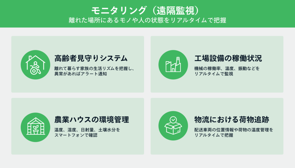 離れた場所にあるモノや人の状態をリアルタイムで把握する機能です。センサーが取得したデータをインターネット経由で確認できるため、現地に行かなくても状況を監視できます。
