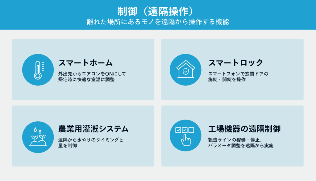 離れた場所にあるモノを遠隔から操作する機能です。スマートフォンやパソコンなどの端末を通じて、デバイスのON/OFF、設定変更、動作指示などを行えます。