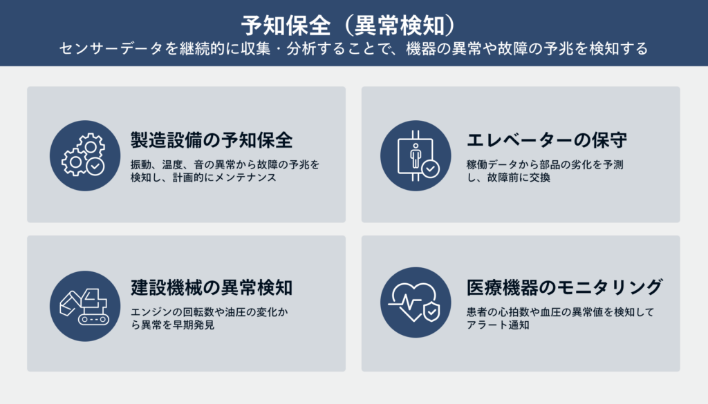 ・製造設備の予知保全:振動、温度、音の異常から故障の予兆を検知し、計画的にメンテナンス