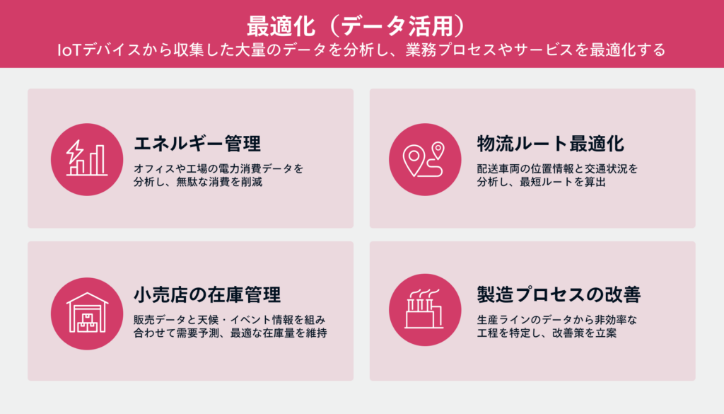 IoTデバイスから収集した大量のデータ(ビッグデータ)を分析し、業務プロセスやサービスを最適化する機能です。AIや機械学習と組み合わせることで、より高度な最適化が可能になります。