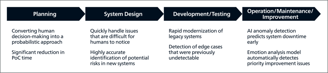 システム開発プロセスやUI/UXデザイン、予測分析やコミュニケーションに至るまで、