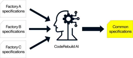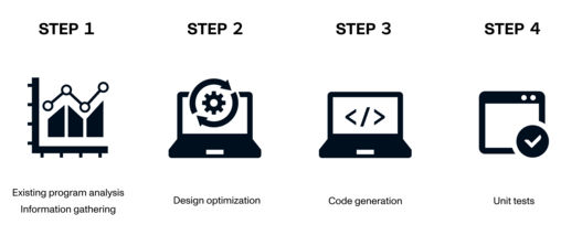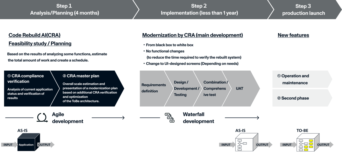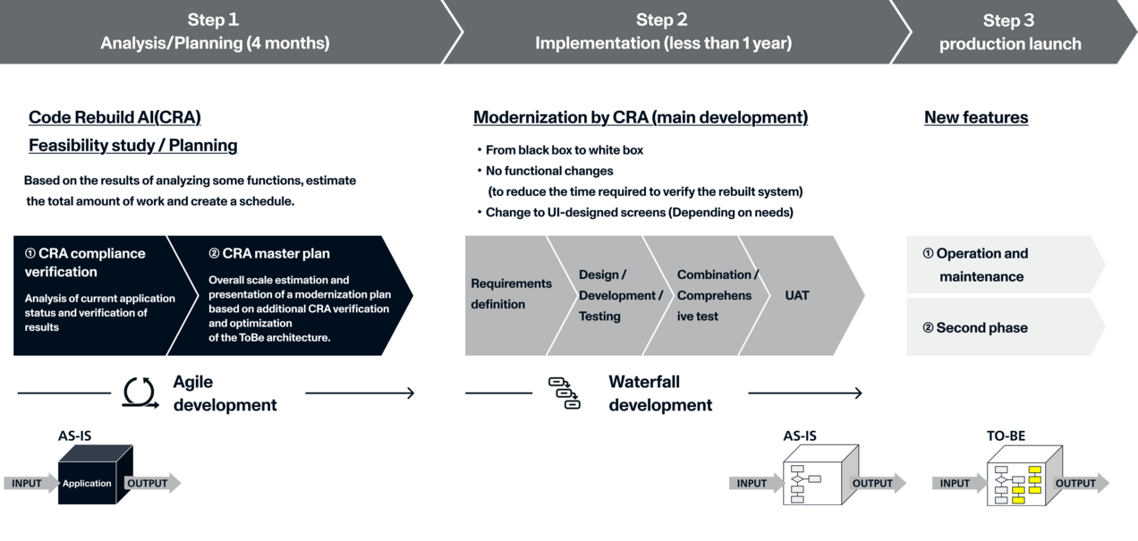 We utilize generative AI to analyze source code structure and rewrite it into new code, enabling a complete overhaul of system specifications.