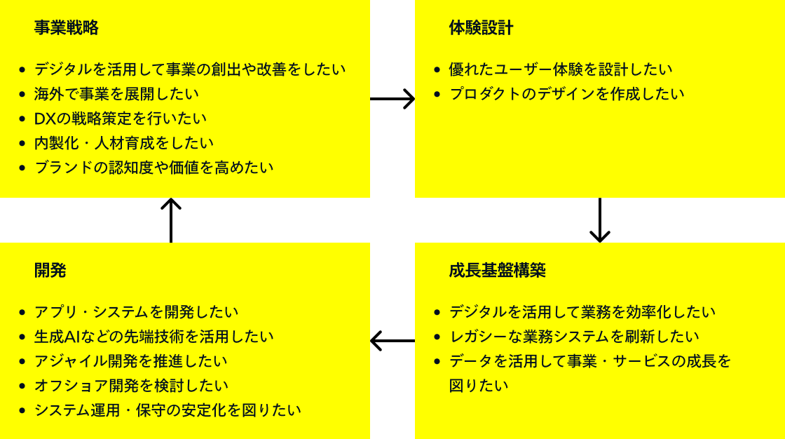 貴社の課題解決・デジタル変革に向けて各フェーズに伴走いたします。