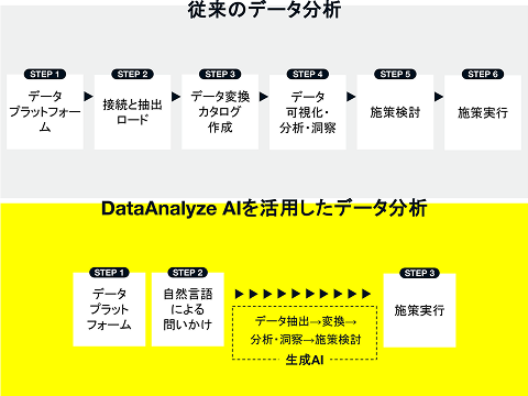 複数の基盤にまたがる データを自然言語で抽出し、分析・洞察を提供することで、施策実行までの工数を大幅に削減。