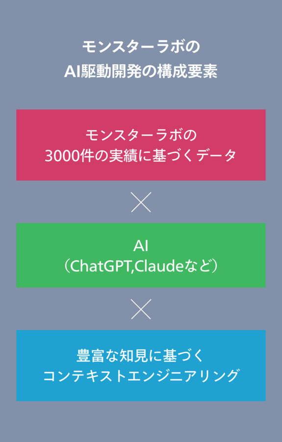 モンスターラボのAI駆動開発は、「データ×AI×コンテキストエンジニアリング」で開発の各フェーズを爆速化。3,000件の実績が蓄積されたデータをAIが分析し、豊富な知見を持つエンジニアが最適な設計を行うことで、高精度なAI駆動開発を実現します。