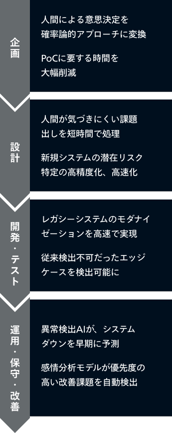 開発・運用コストを大幅に削減するほか、当社の生成AIソリューションを組み合わせてUI/UXやデータ分析を行い、より高度で効率的な運用を実現します。