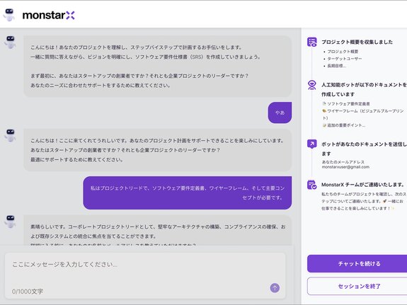 最先端のAIを活用。チャットボットにプロジェクトビジョン(アイデアや目標)を打ち込むだけで、プロジェクトを視覚化できるSRSやワイヤーフレームが数分で完成。その後モンスターラボのエキスパートにより、数週間でMVPを納品。継続的な改善も行います。