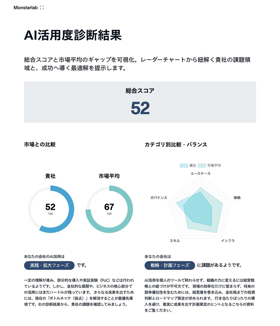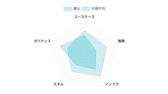 数多くの診断データに基づく「市場平均」と貴社の状況を対比し、客観的な活用レベルを算出します。単なるスコアリングに留まらず、優先的に取り組むべき改善領域を特定することで、投資の最適化と戦略的な意思決定を支援します。