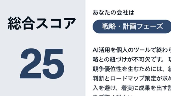 算出されたスコアに基づき、次に踏み出すべき一手を具体的に提言。専門的な知見に基づいた実践的なロードマップを示すことで、組織が迷うことなくAI導入・活用を次のフェーズへと進めるための道標を提供します。