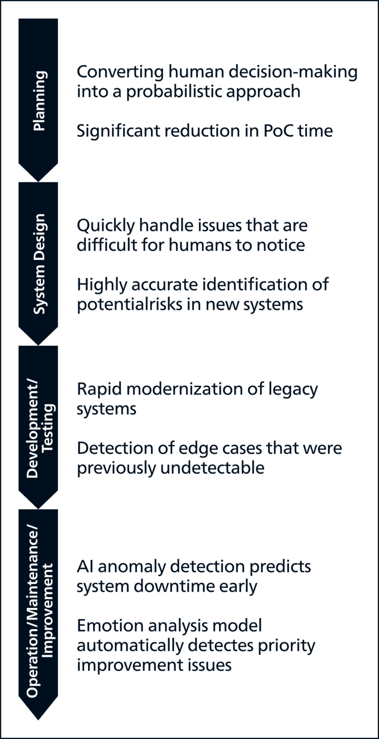 システム開発プロセスやUI/UXデザイン、予測分析やコミュニケーションに至るまで、