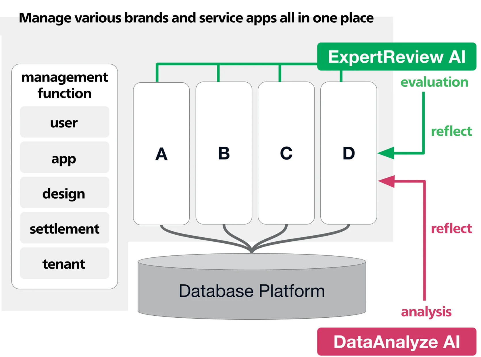 By centralizing the development and operations of multiple applications, you can prevent the dispersion of source code and reduce both development and operational costs. This also allows for the unified implementation of third-party services, such as in-app purchases.