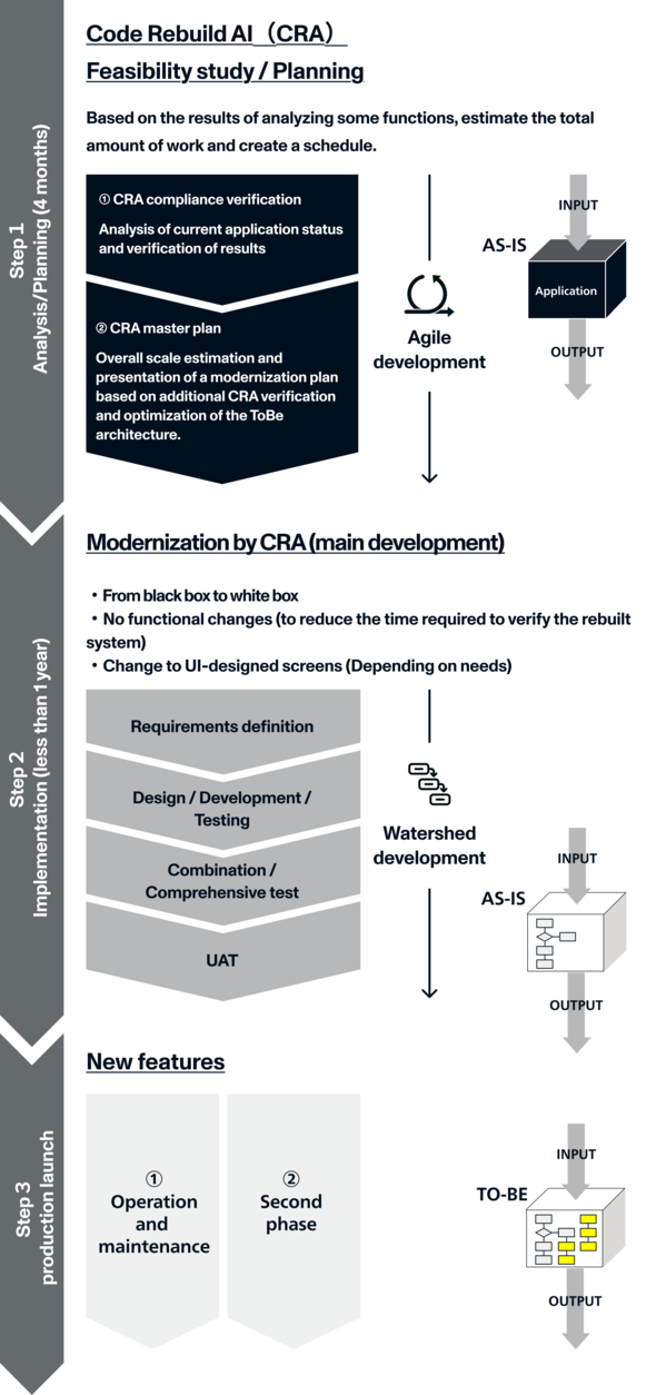 We utilize generative AI to analyze source code structure and rewrite it into new code, enabling a complete overhaul of system specifications.